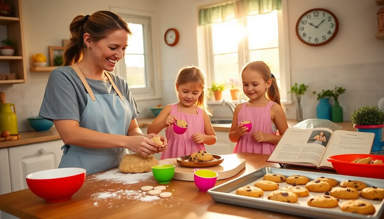 A woman pulls golden cookies from the oven in a cozy kitchen.